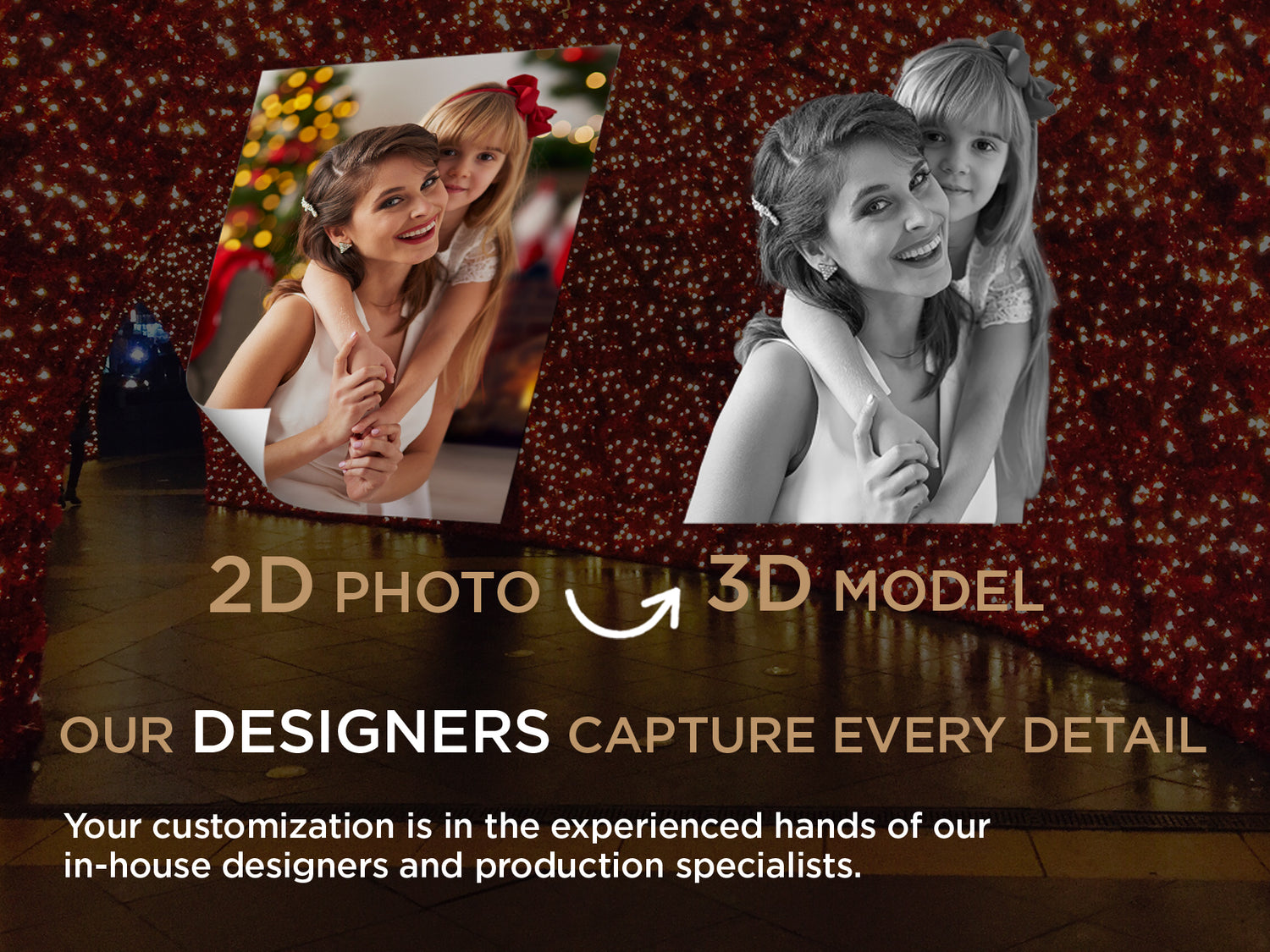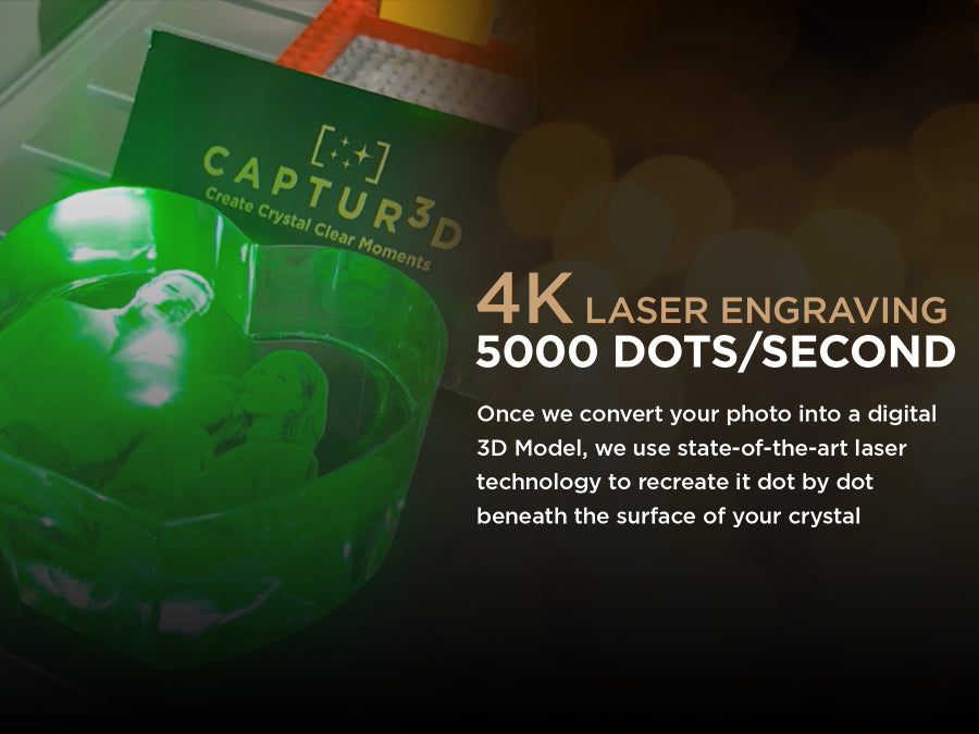 A: CAPTUR3D has an easy 3-step ordering process. First, choose the size of the crystal that suits your needs. Next, upload the high-resolution, clear, and well-lit photo that you want to be engraved. Ensure that the number of people in the photo corresponds with the size of the crystal you have selected. Lastly, submit your order. We'll take care of the rest!